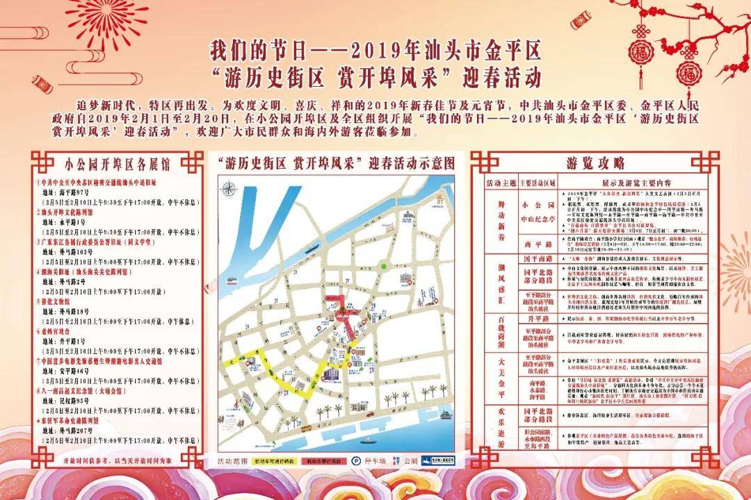 追梦新时代,特区再出发。为欢度文明、喜庆、祥和的2019年新春佳节及元宵节,中共汕头市金平区委、金平区人民政府自2019年2月1日至2月20日,在小公园开埠区及全区组织开展“我们的节日——2019年汕头市金平区‘游历史街区 赏开埠风采’迎春活动”