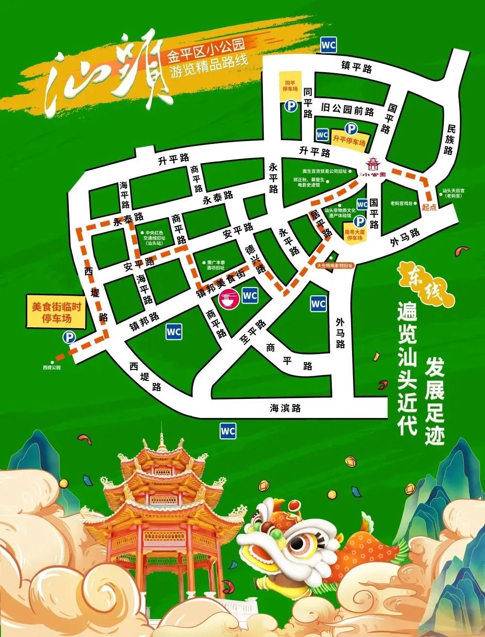 汕头天后宫(老妈宫)-中山纪念亭-南生百货贸易公司旧址-汕头非物质文化遗产体验馆-郑正秋、蔡楚生电影史迹馆-大光明电影院旧址-镇邦美食街(德兴路口)-镇邦美食街-萧广丰泰酒坊旧址-安平路-中央红色交通线旧址(汕头站)-西堤路-西堤公园(镇邦美食街临时停车场)